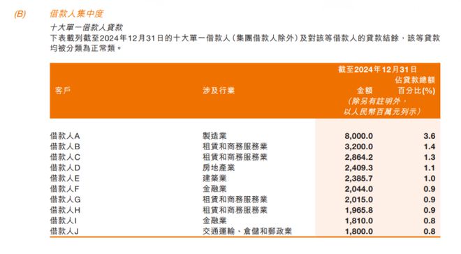 年报显示,截至2024年底,前十大单一借款人借款余额高达284.9亿元,占同期资本净额319亿元的89%,如此之高的贷款集中度在省级城商行中恐怕也找不出第二家。