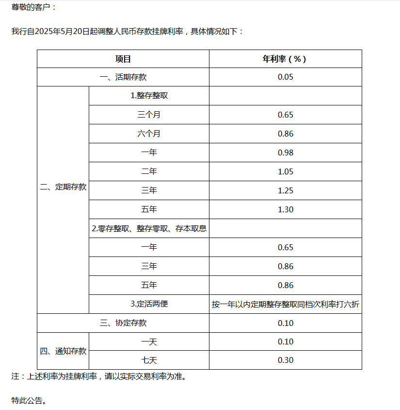5月20日,邮储银行对多个期限的人民币存款利率进行了下调,其中活期存款利率下调至0.05%;定期三个月期、半年期、一年期、三年期和五年期均有下调,分别为0.65%、0.86%、0.98%、1.25%和1.30%。